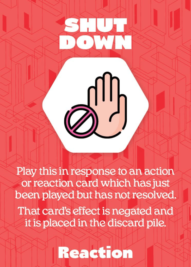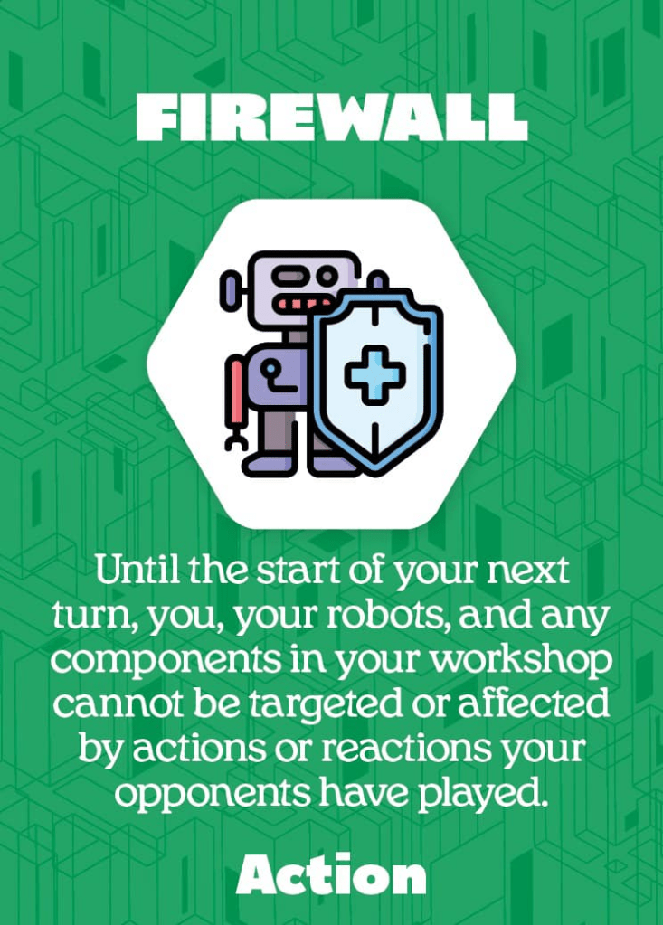 Reaction cards are similar, but require a specific event to occur before they can be played. Unlike action cards however, they can be played in another player’s turn, giving you an opportunity to put a glitch in your opponent’s well oiled plans! Whether it’s shutting down a key action card or even delaying the repair of one of their robots, Reactions give players powerful options to control, alter and delete the opposition.
