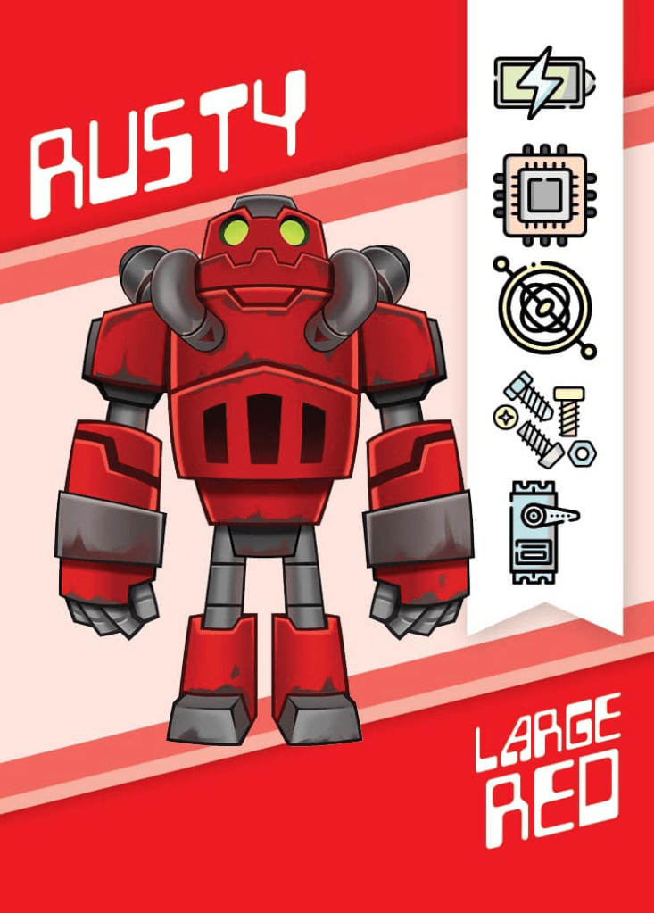 Each player chooses a set of three Robots that they are tasked with repairing and places each of them with the “front side” facing up. Each Robot has a different combination of components needed to repair it, which players will need to gather through the drafting of cards.